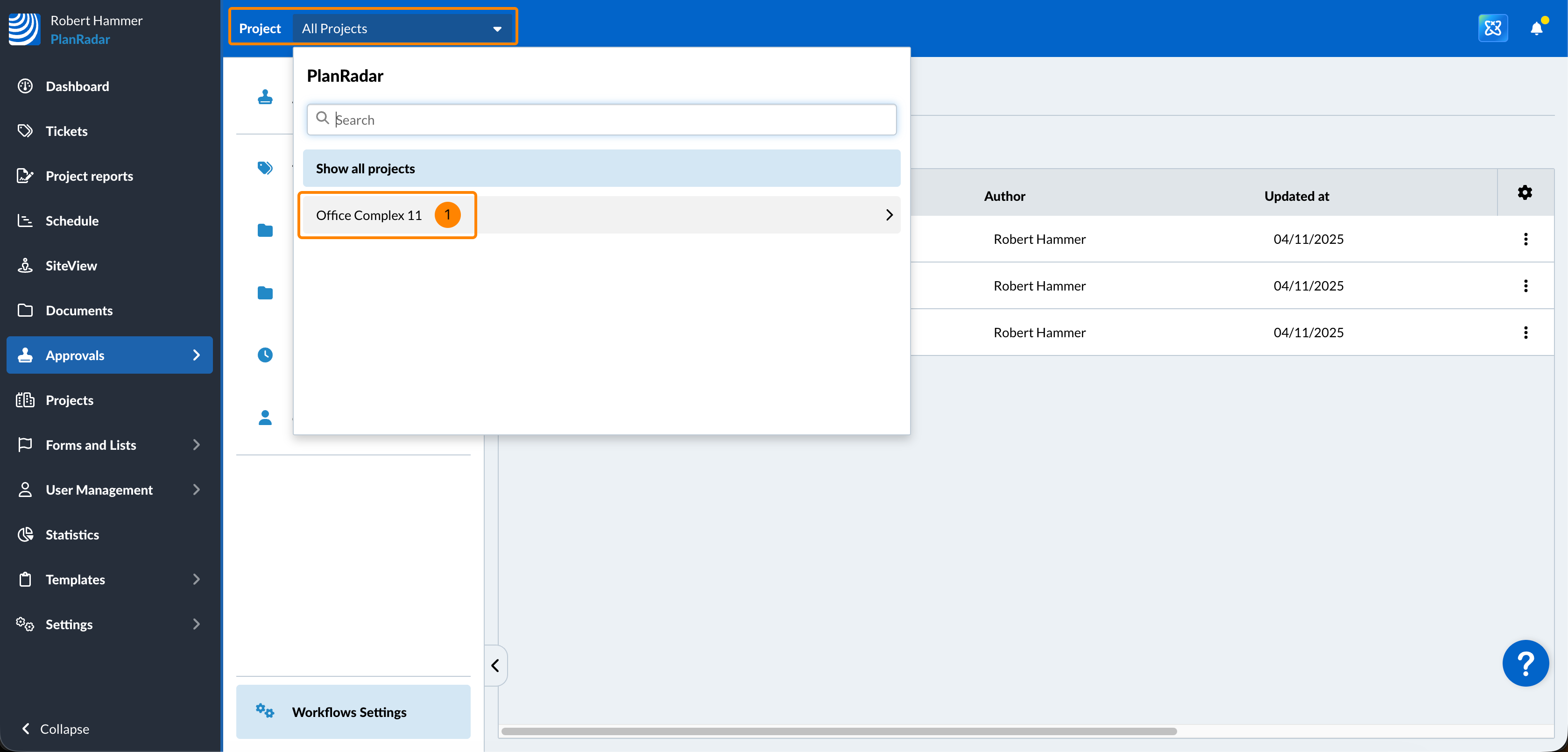Proszę dodać przepływy pracy zatwierdzania do formularzy lub do sekcji Dokumentów w projektach, aby udostępnić je podczas żądania zatwierdzenia. Więcej informacji można znaleźć na stronie Zarządzanie przepływami pracy zatwierdzania projektu.