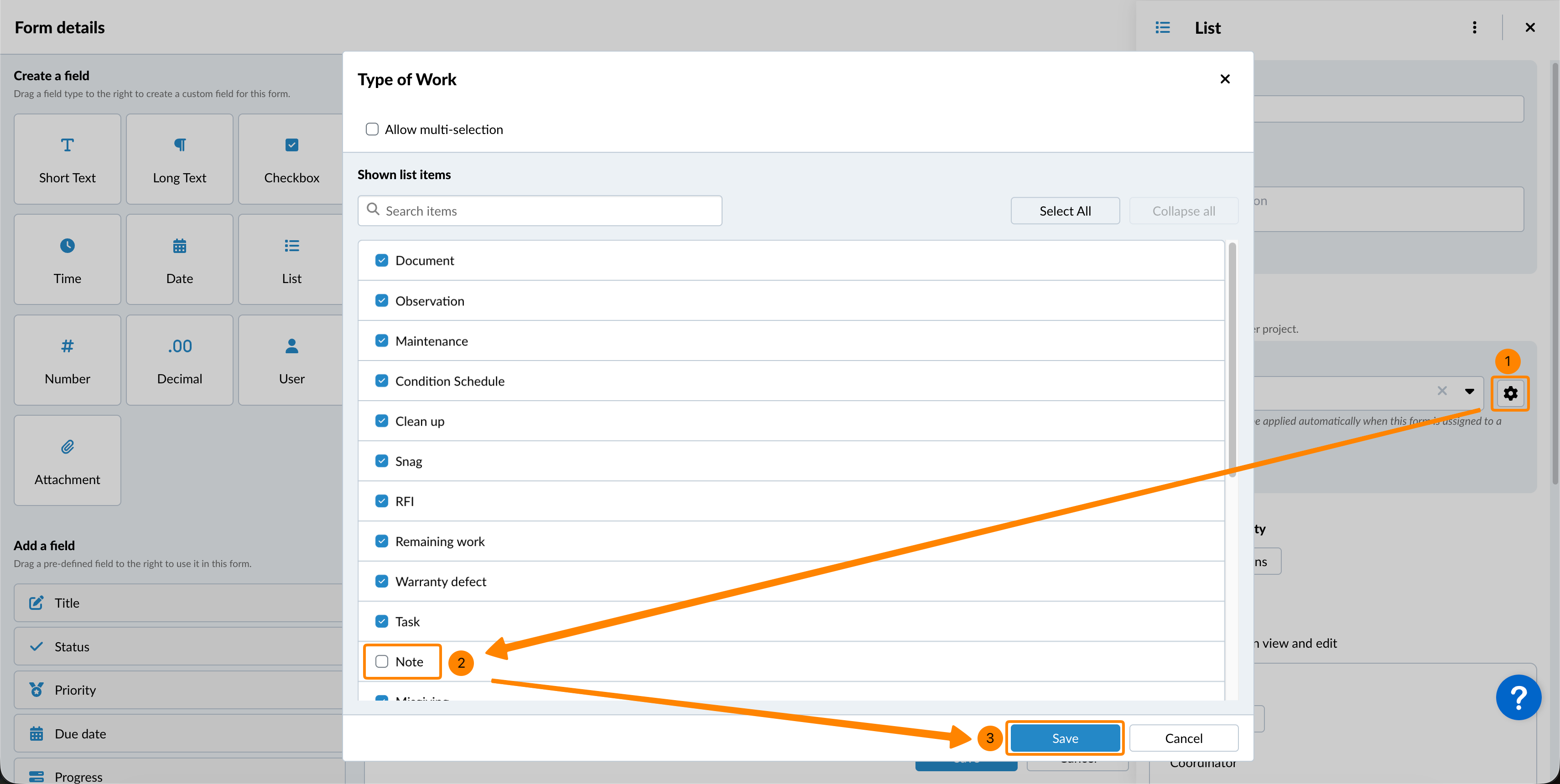 Po dodaniu niestandardowego pola listy można przypisać do niego listę domyślną. W tym miejscu można przypisać tylko listy globalne. Listy specyficzne dla projektu można przypisać później, gdy formularz zostanie dodany do projektu. Więcej informacji można znaleźć na stronie Lists.