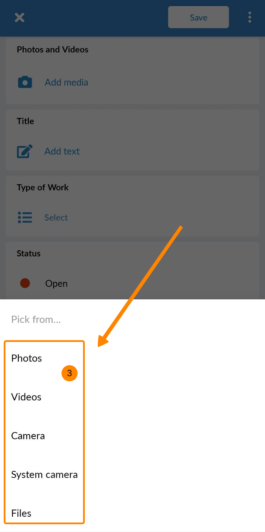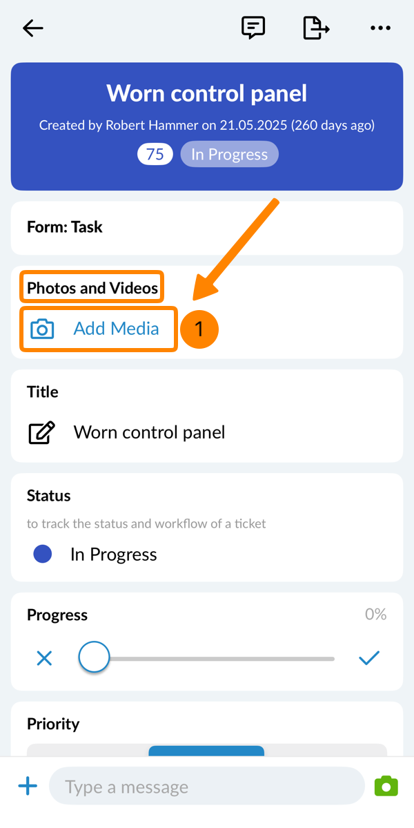 Na urządzeniach mobilnych można dodawać ogólne załączniki, wykonując zdjęcia lub filmy, wybierając multimedia z urządzenia, przesyłając dokumenty lub dodając nagrania audio.