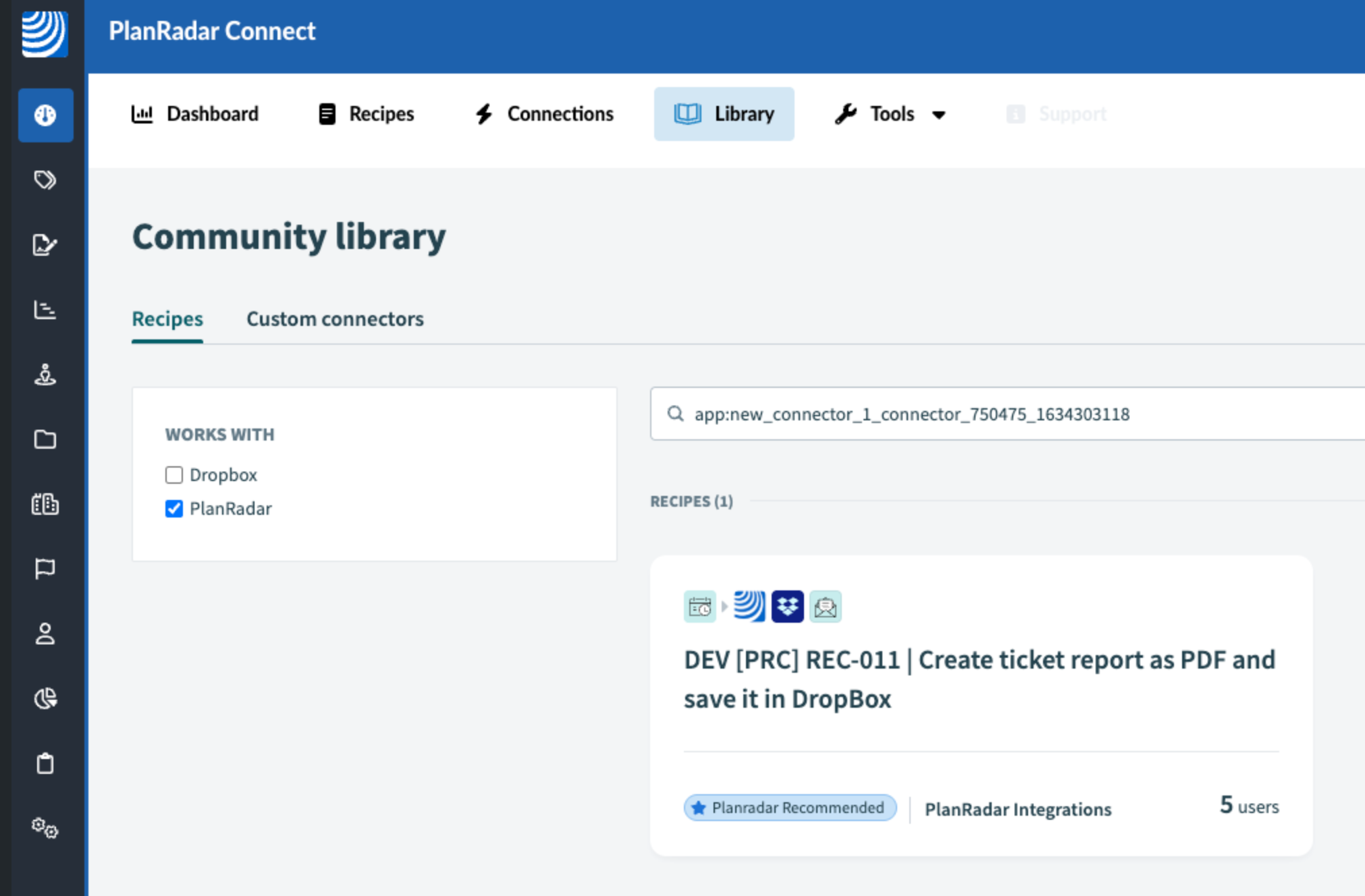 Proszę kliknąć Biblioteka i wyszukać 'PlanRadar'