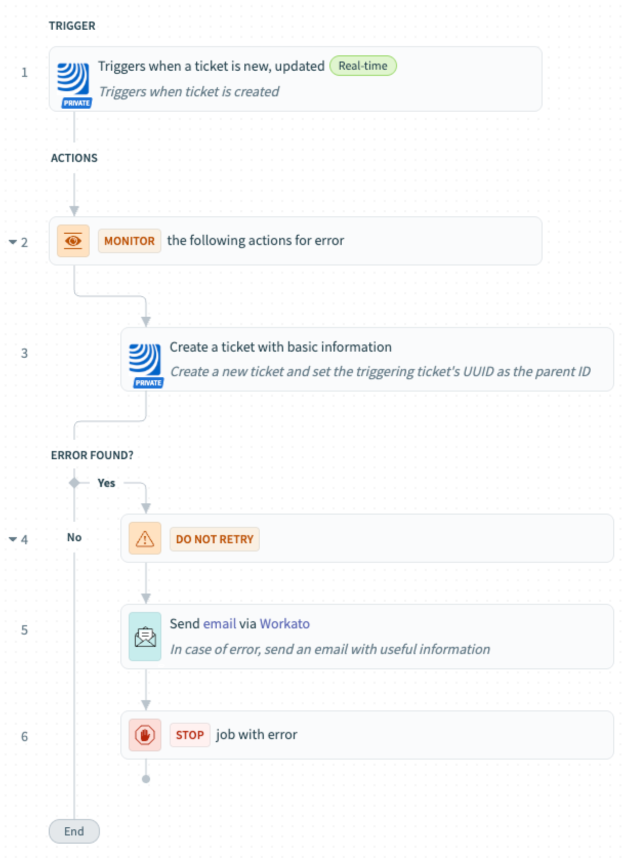Gdy tworzony jest nowy bilet , receptura uruchamia się i natychmiast tworzy powiązany bilet podrzędny ze zdefiniowanymi ustawieniami.
