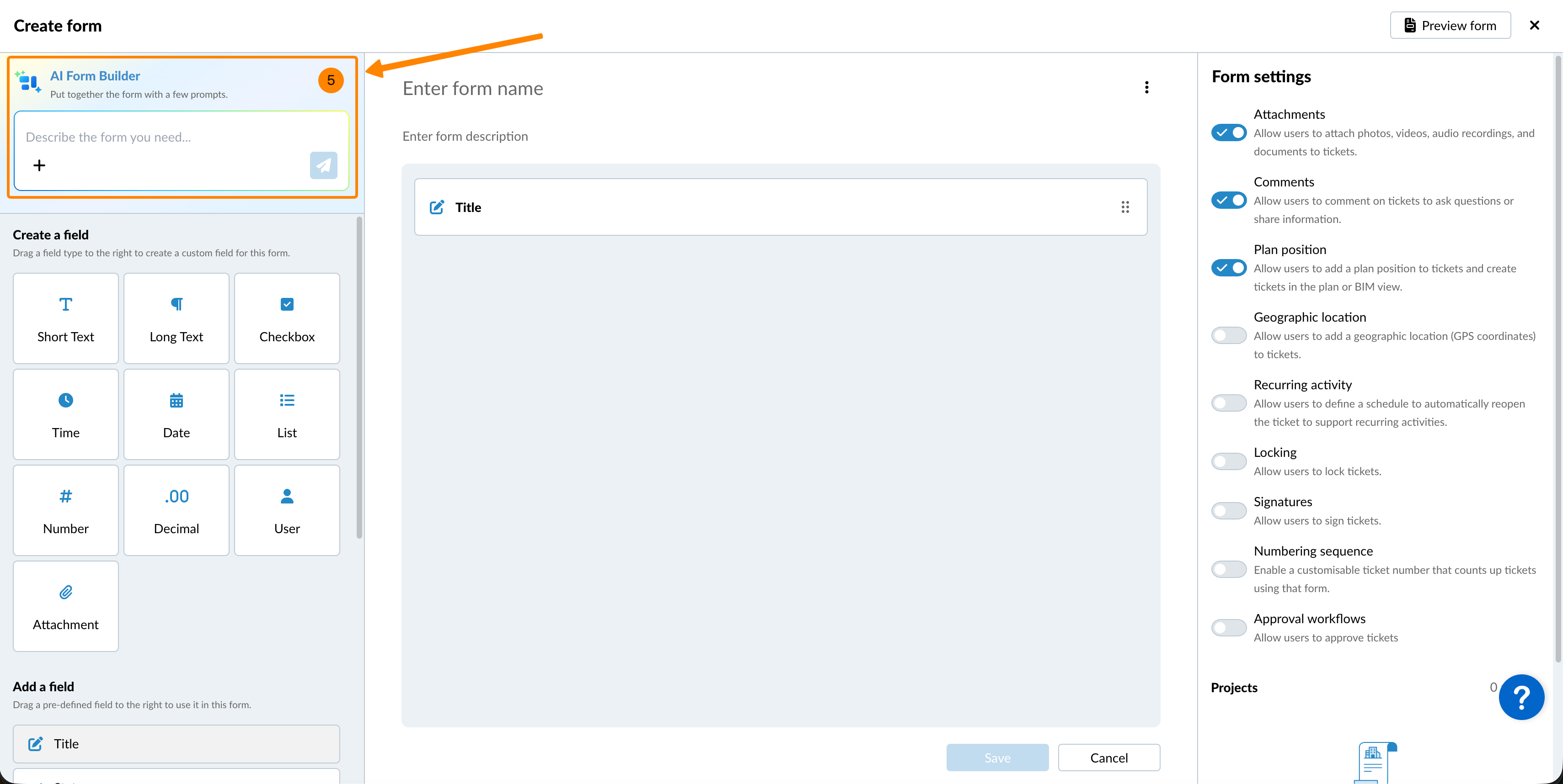 AI Form Builder tworzy i konfiguruje formularze na podstawie opisu w języku naturalnym lub przesłanego dokumentu - niezależnie od tego, czy rozpoczynają Państwo nowy formularz, czy edytują istniejący.