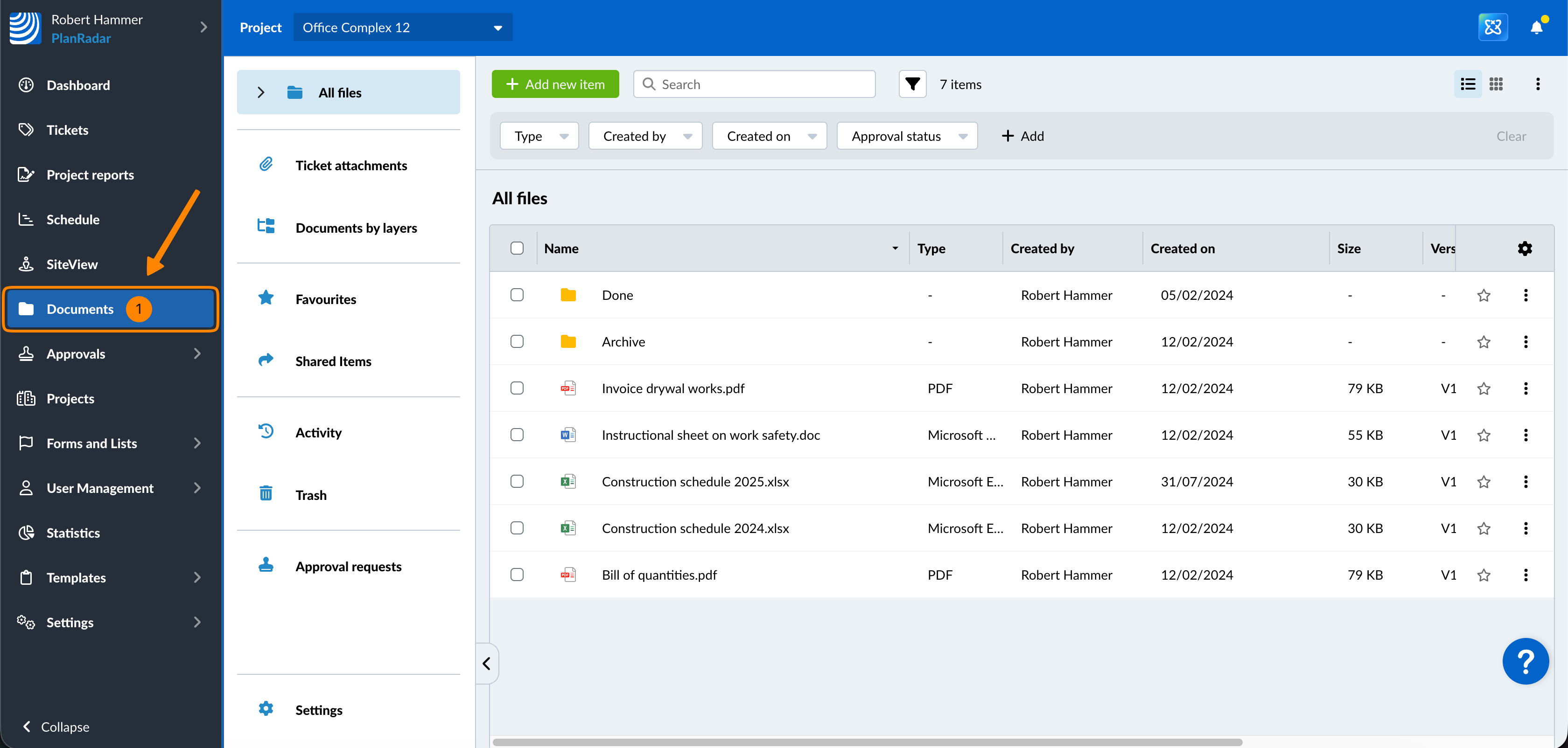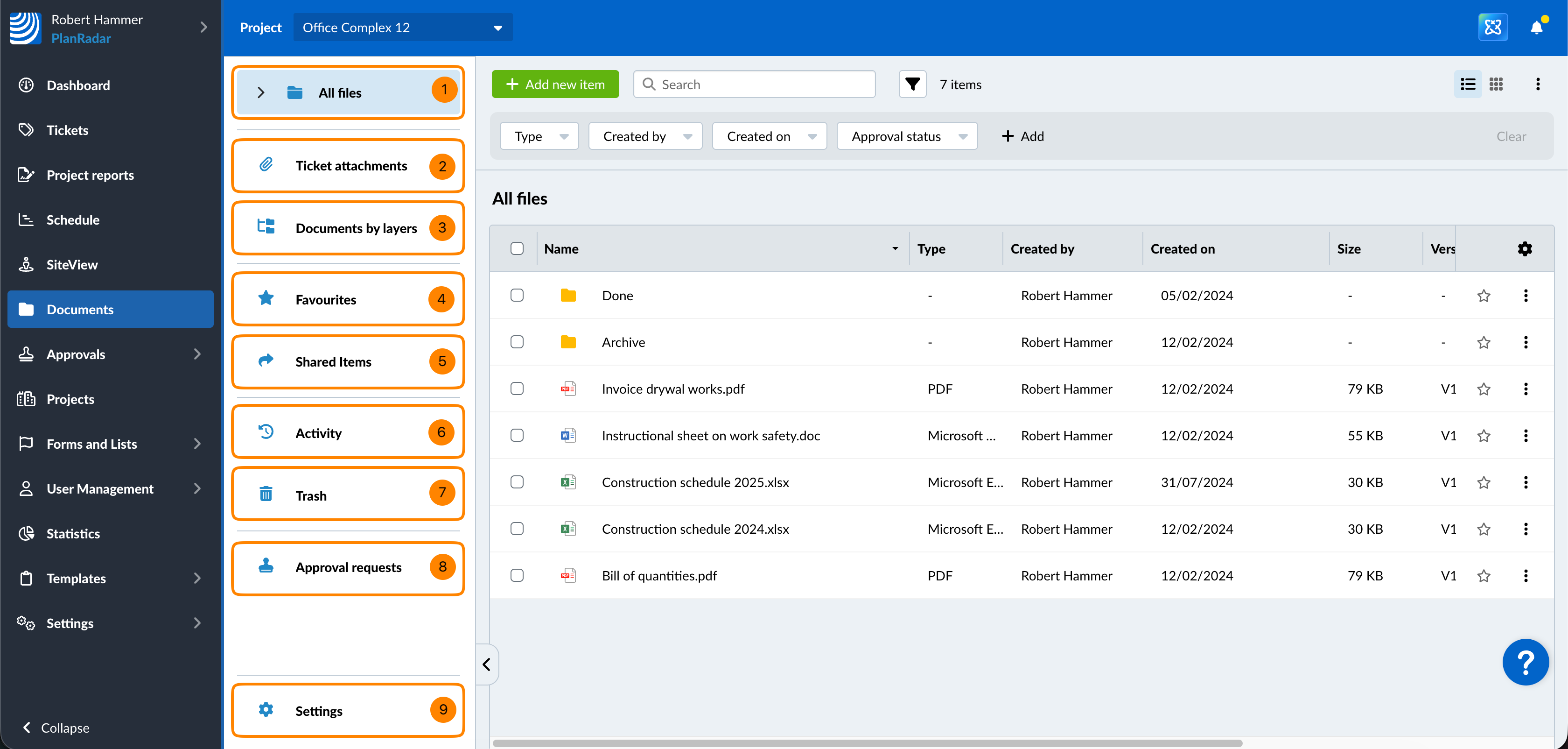 Przechowywanie i organizacja dokumentów - Przesyłaj, organizuj i przechowuj wszystkie dokumenty w PlanRadar, podobnie jak w innym oprogramowaniu do udostępniania plików, i korzystaj z dostępu do nich na tej samej platformie PlanRadar, co wszystkie inne dane projektu. Dostęp do dokumentów i plików można uzyskać z aplikacji mobilnej PlanRadar nawet w trybie offline.