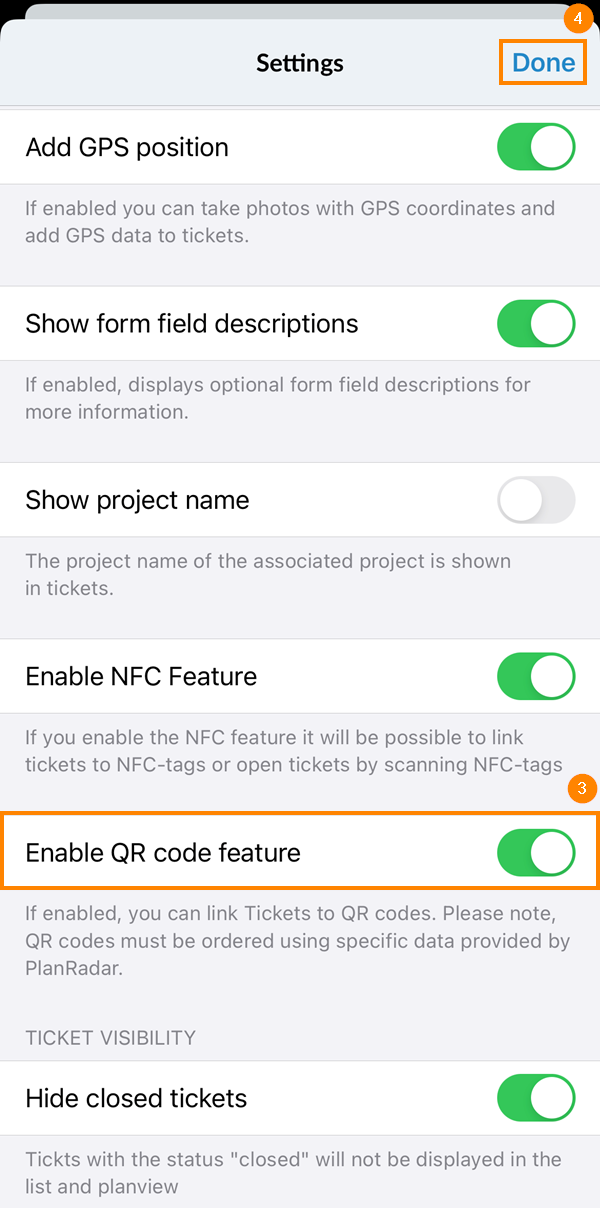 W przypadku korzystania z aplikacji kamery nie jest konieczne włączanie tej funkcji w ustawieniach aplikacji mobilnej PlanRadar.