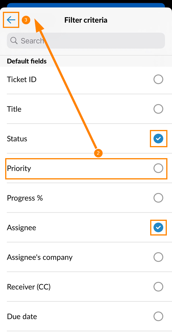 Os critérios selecionados mostram uma marca de seleção azul . - Toque em back para confirmar a seleção e adicionar os critérios ao filtro atual.