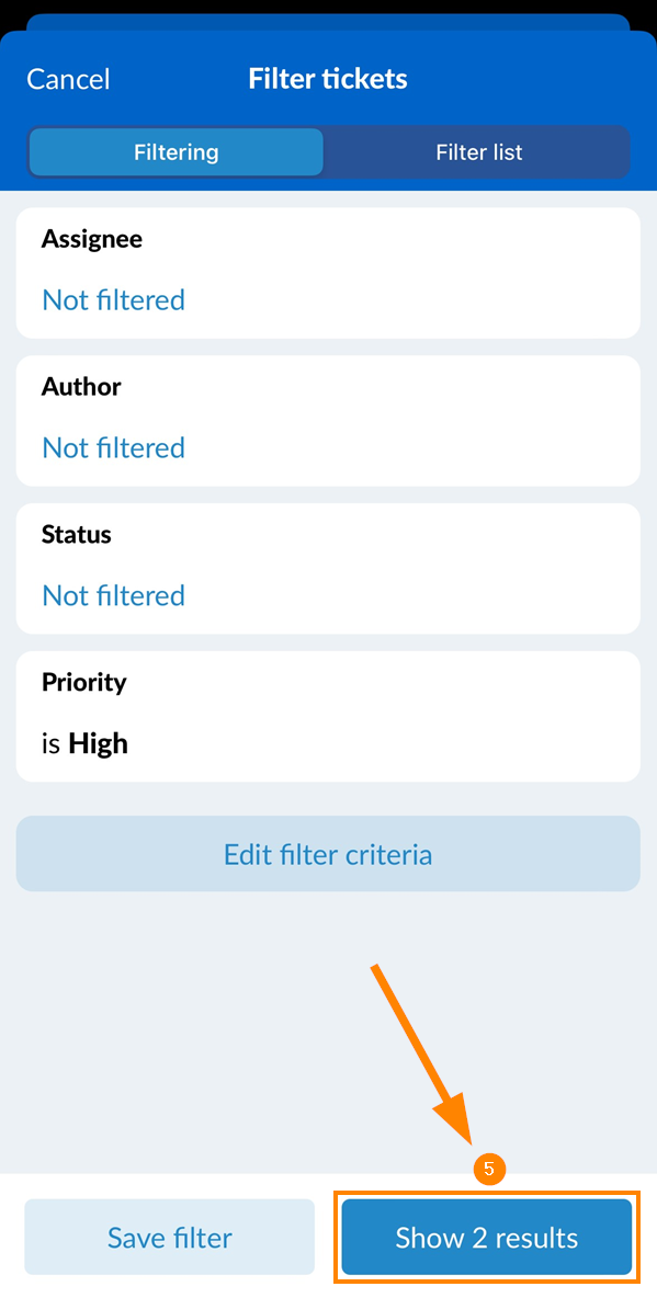 - Toque em Show 2 results (o botão mostra o número de bilhetes que correspondem aos critérios)