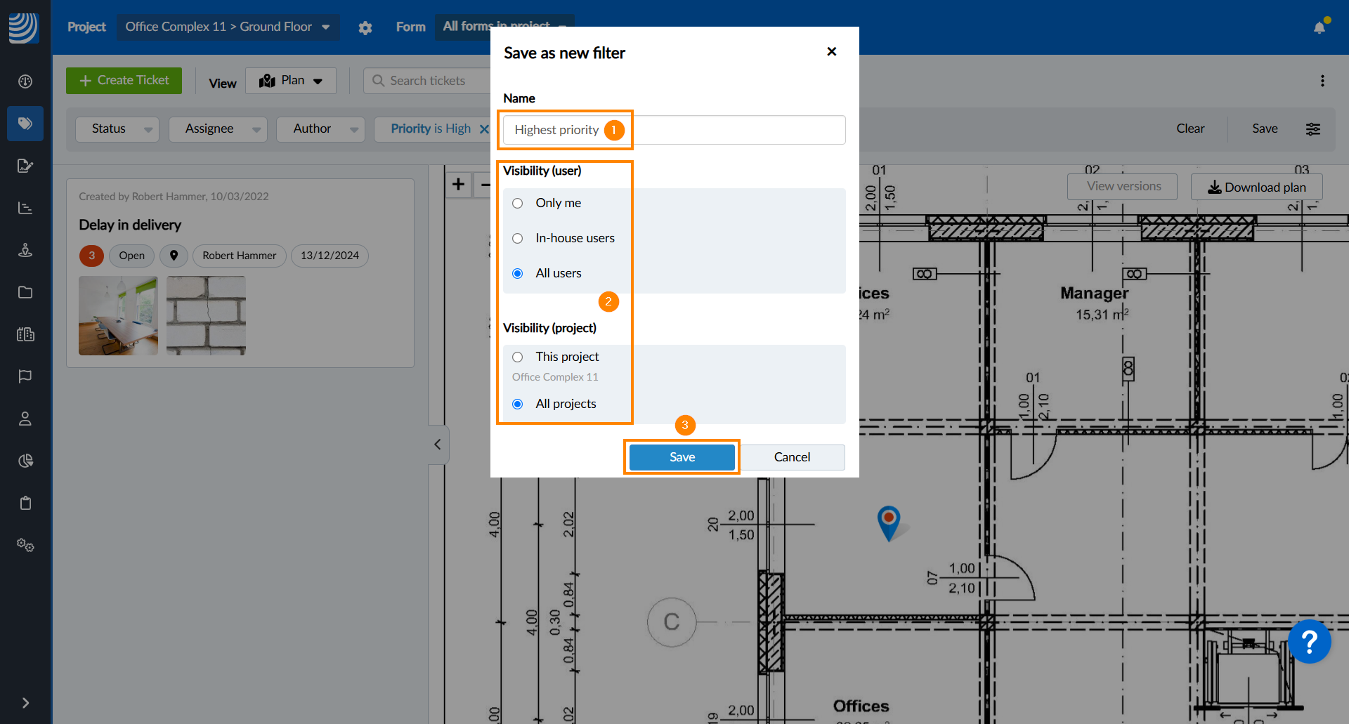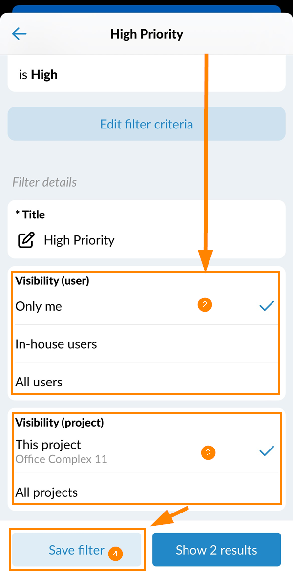 Todos os projetos → selecione se o filtro for útil em todos os projetos. - Toque em Save para confirmar