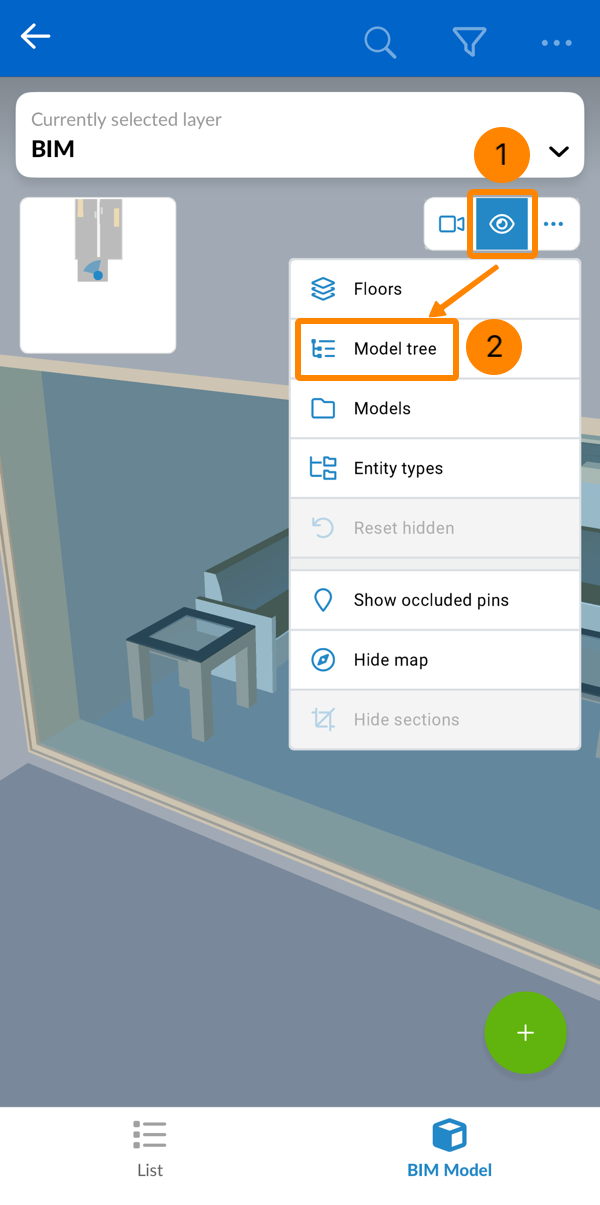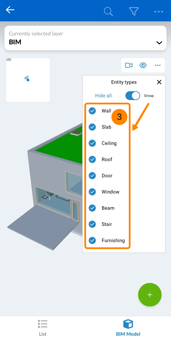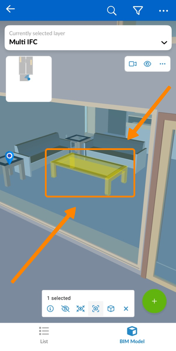 - Toque em uma camada com um modelo BIM (marcado por um ícone de cubo)