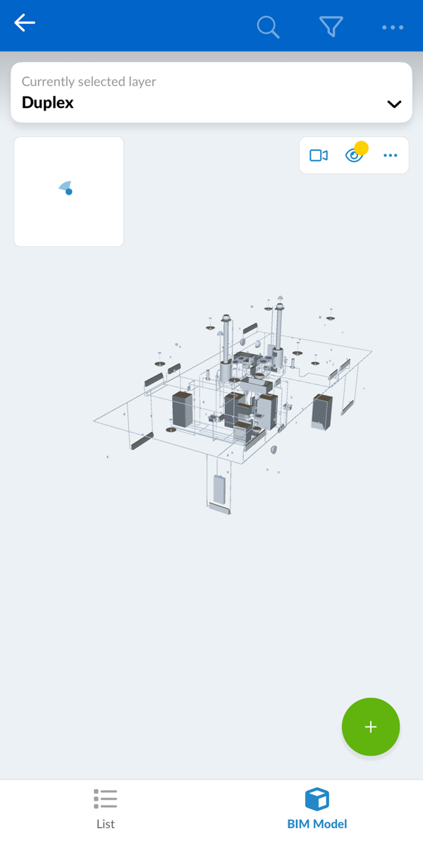 O PlanRadar também suporta o trabalho com modelos IFC federados, o que significa visualizar vários modelos IFC ao mesmo tempo. Para facilitar a navegação no modelo BIM, é possível alternar entre os modos de câmera livre e de caminhada. Além disso, um mapa de visão geral 2D permite ajustar rapidamente a sua posição e a orientação da câmera.