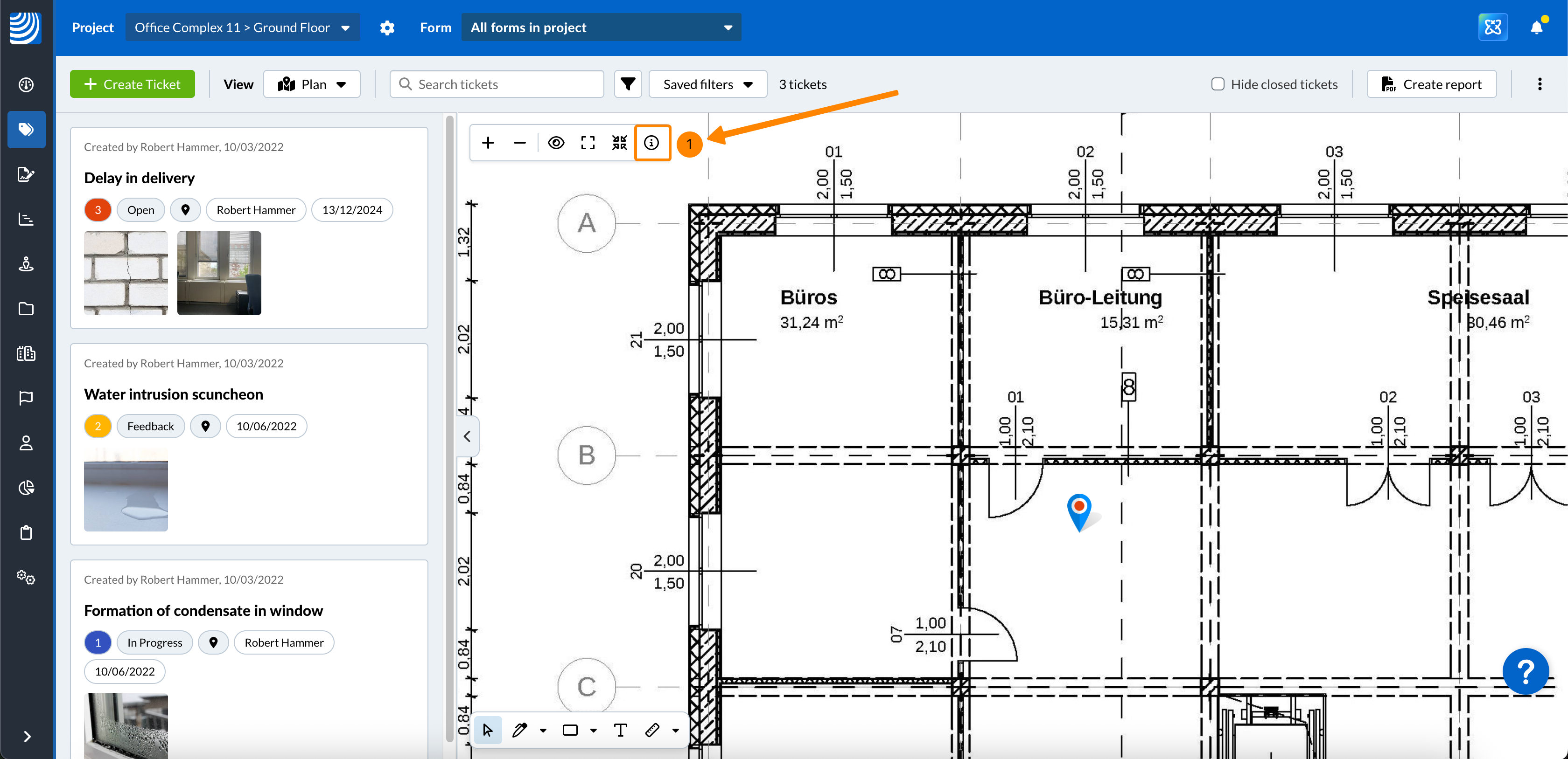 - Clique no tíquete na lista de tíquetes para mostrar automaticamente o pino do tíquete no plano e abrir a visualização do tíquete.