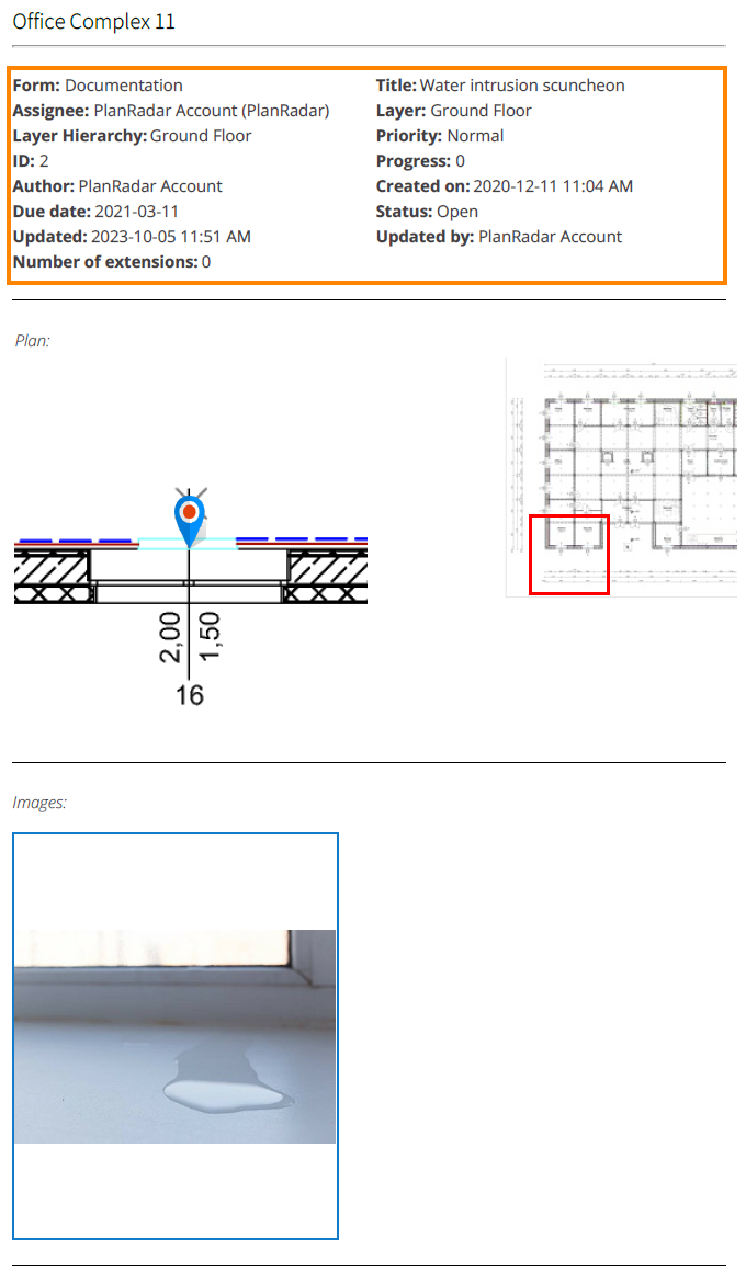 Se os documentos dos tíquetes forem incluídos, seus títulos serão sempre listados na seção Related Documents com links para o documento real no PlanRadar. Eles são colocados após as imagens e antes do diário de cada tíquete.