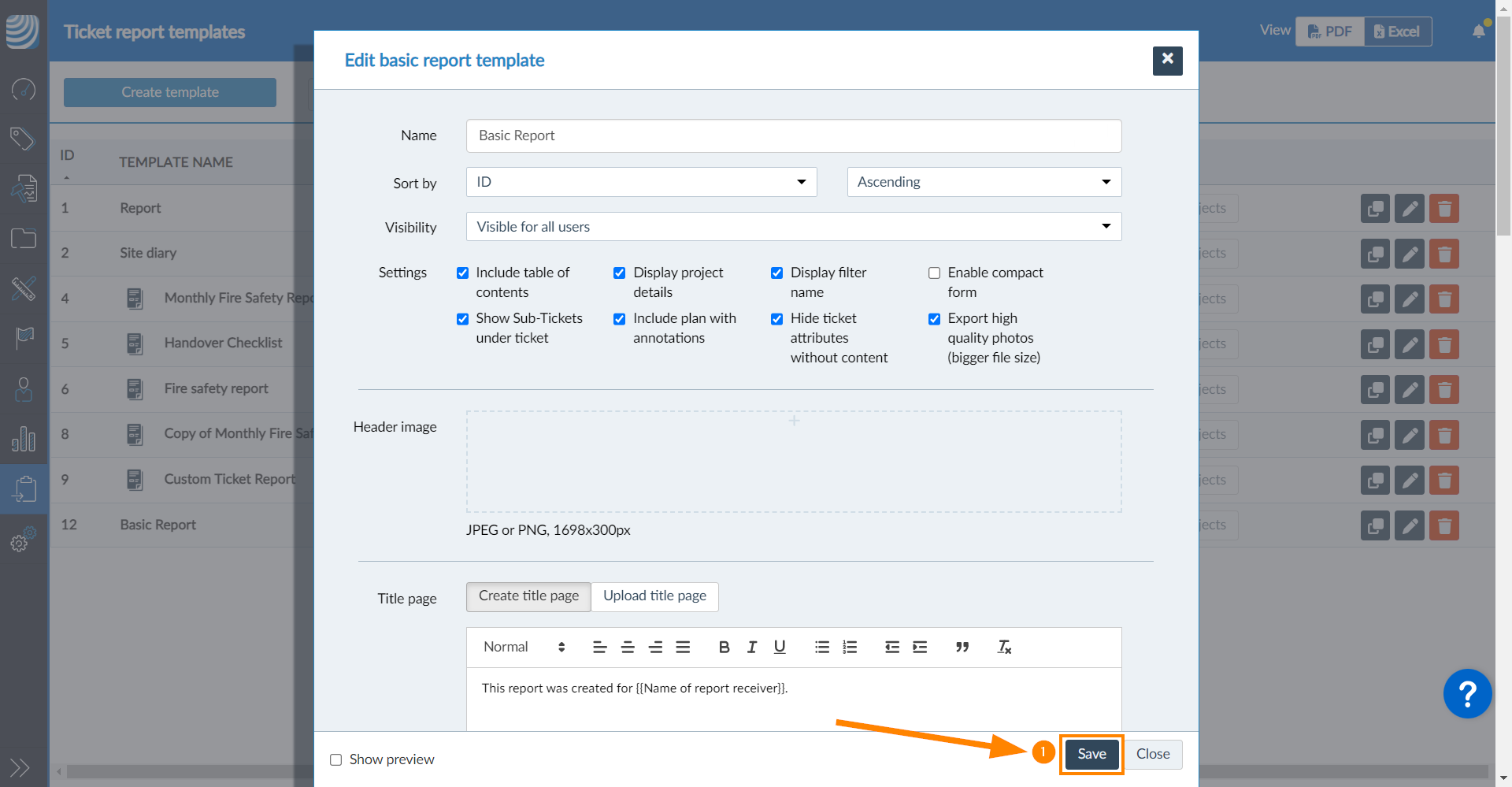 - Incluir índice: Inclua um índice com os títulos dos tíquetes, IDs e números de página após a página de título.