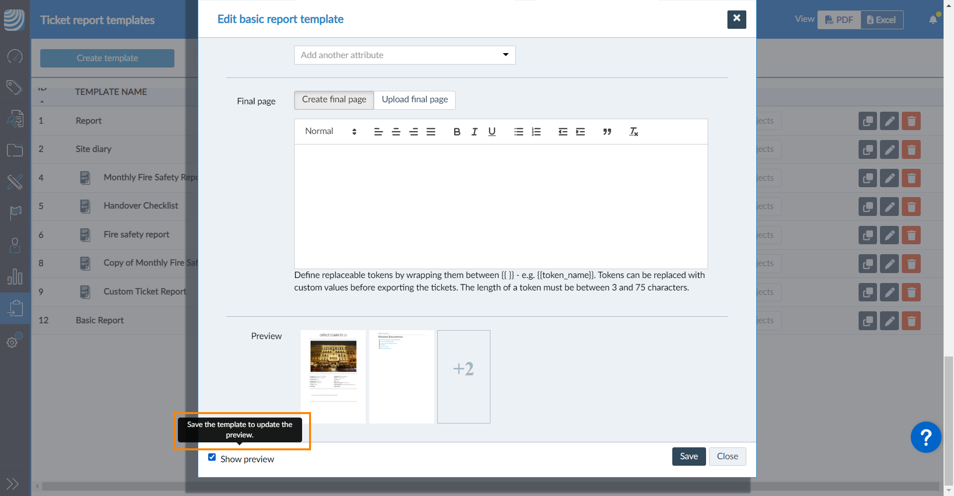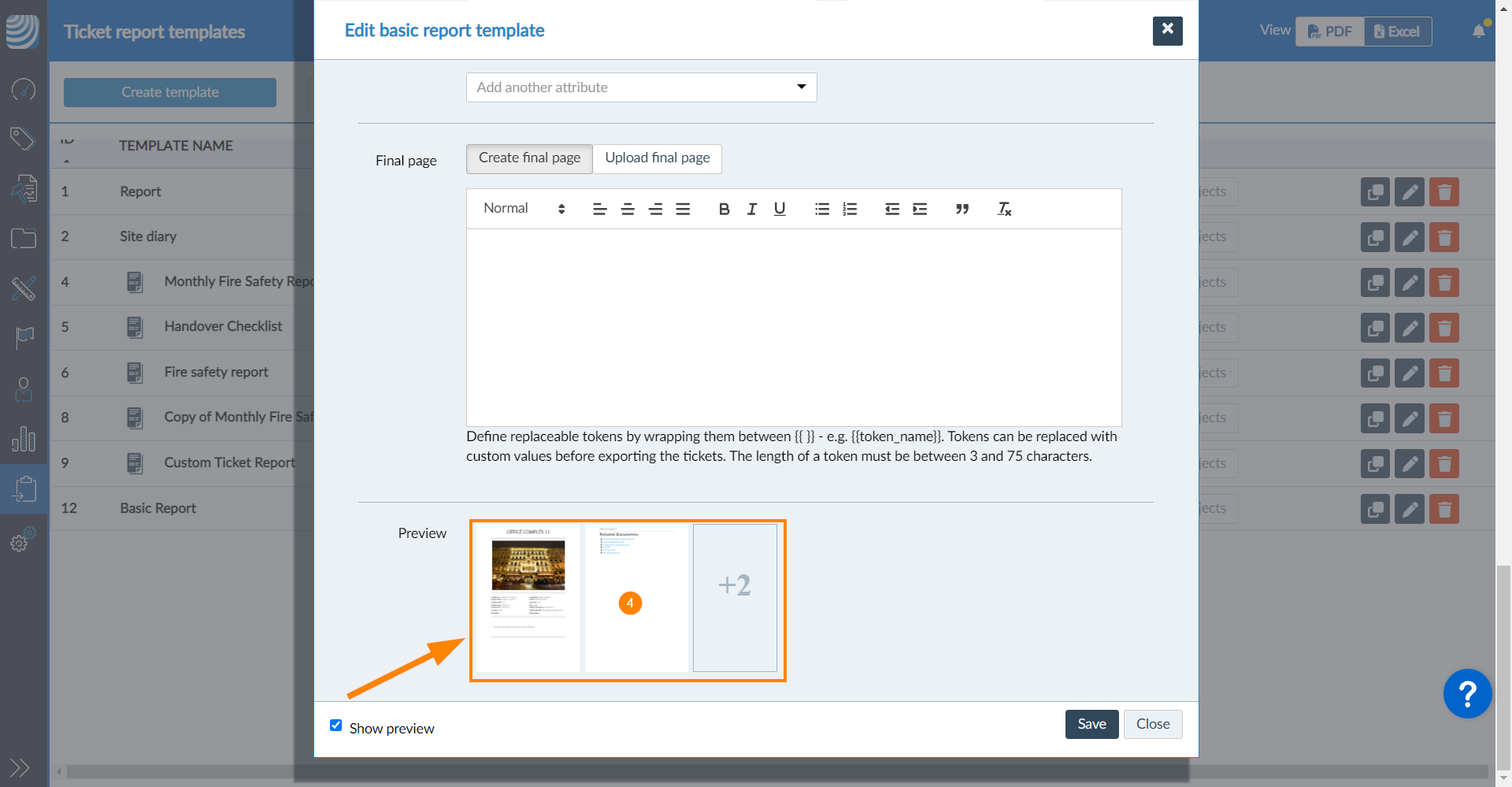 A página final também é opcional e funciona como a página de título , exceto pelo fato de ser colocada no final do relatório. Ela também oferece suporte para Adicionar tokens de substituição aos relatórios de tíquetes.