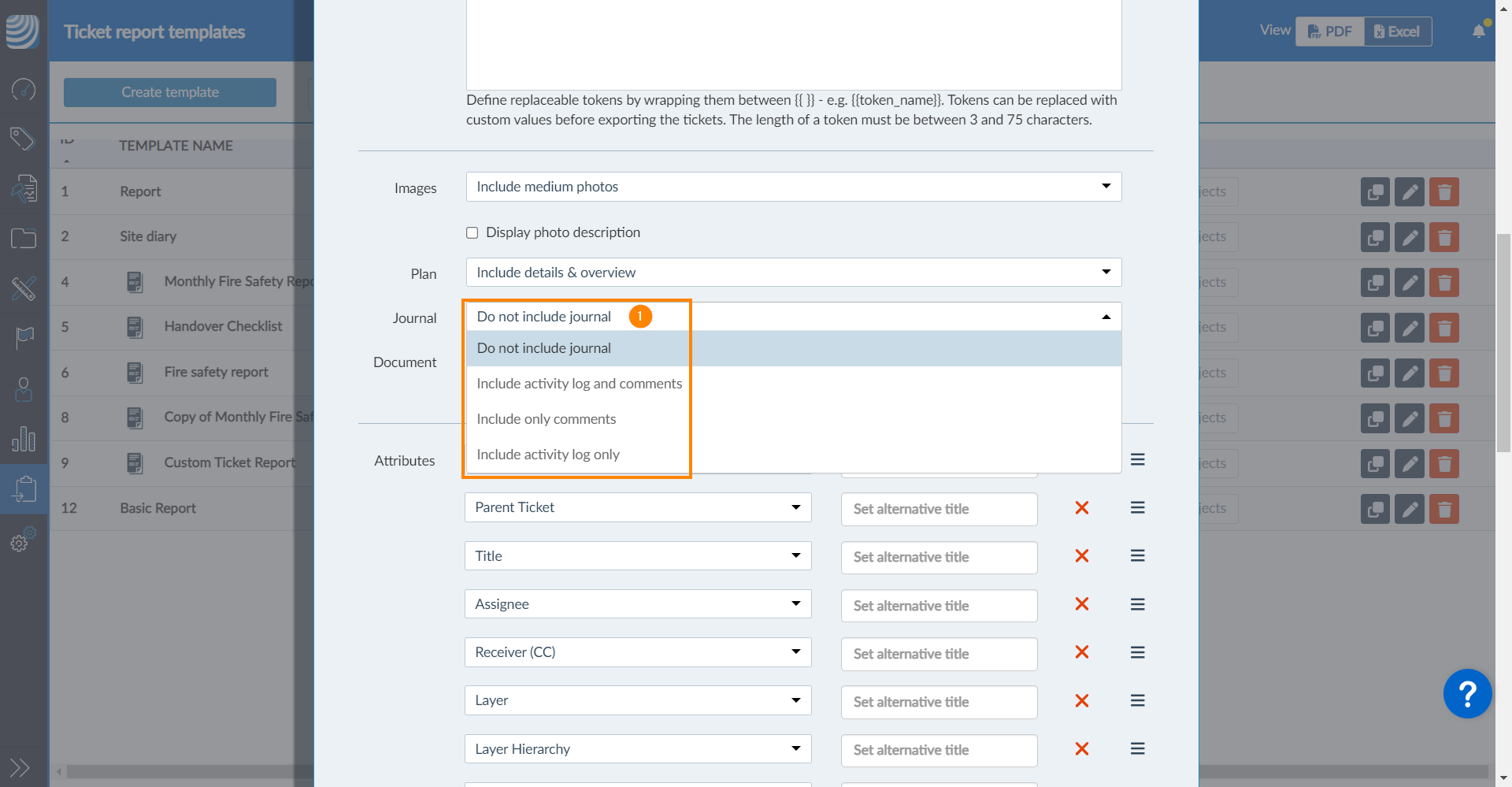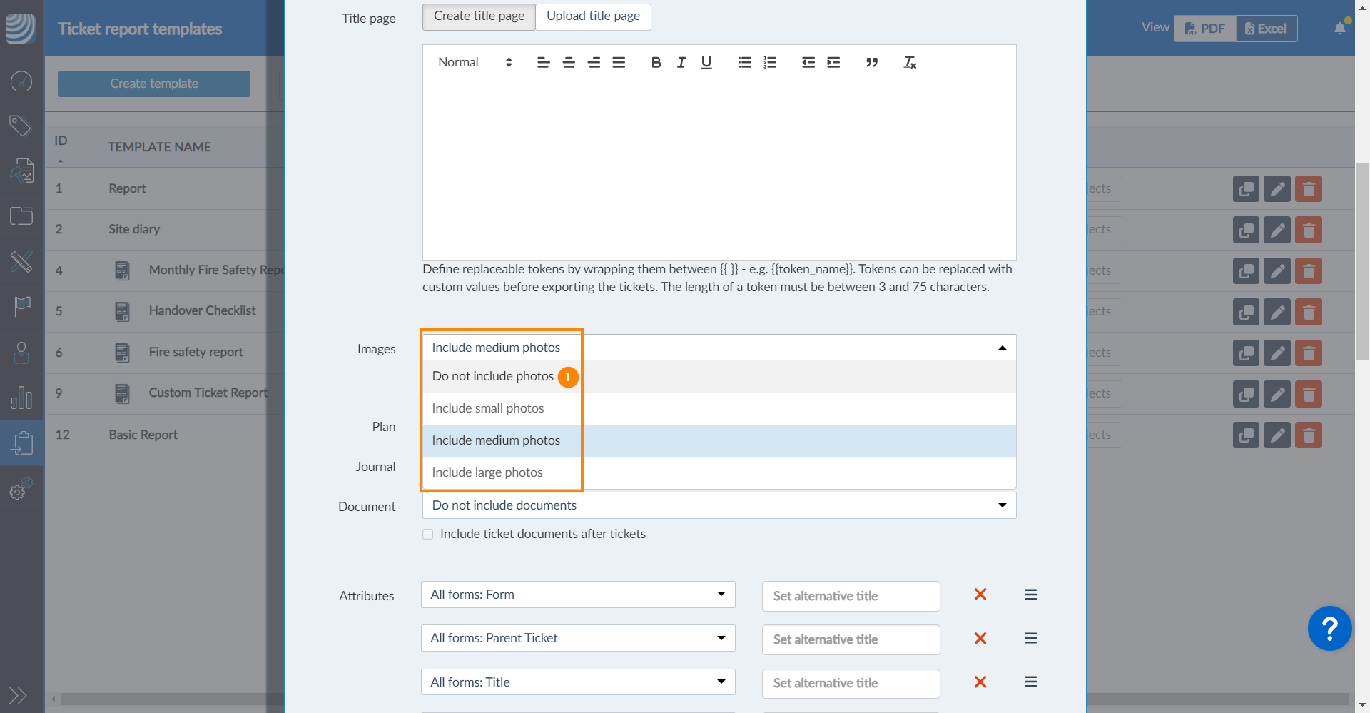 Opcionalmente, o senhor pode criar uma página de título personalizada, incluindo o token de substituição, ou carregar uma ou mais páginas de título. Leia mais em Adicionar tokens de substituição aos relatórios de tíquetes.