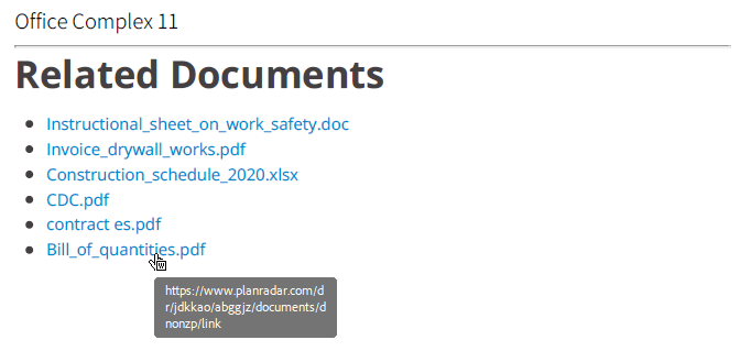 Se os documentos do projeto forem incluídos, seus títulos serão listados em uma página separada em Related Documents com links para o documento real no PlanRadar. A página de documentos relacionados é colocada após a página de título e antes da tabela de conteúdo.