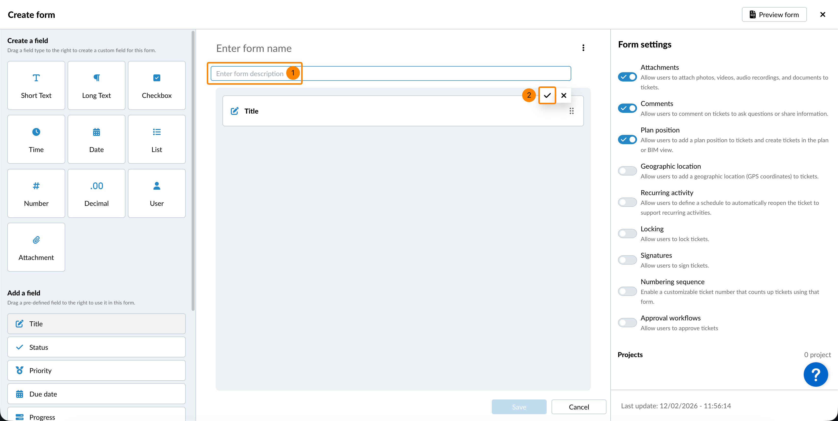 Para saber mais sobre os formulários no PlanRadar e como eles se relacionam com os tíquetes, leia mais em Forms.
