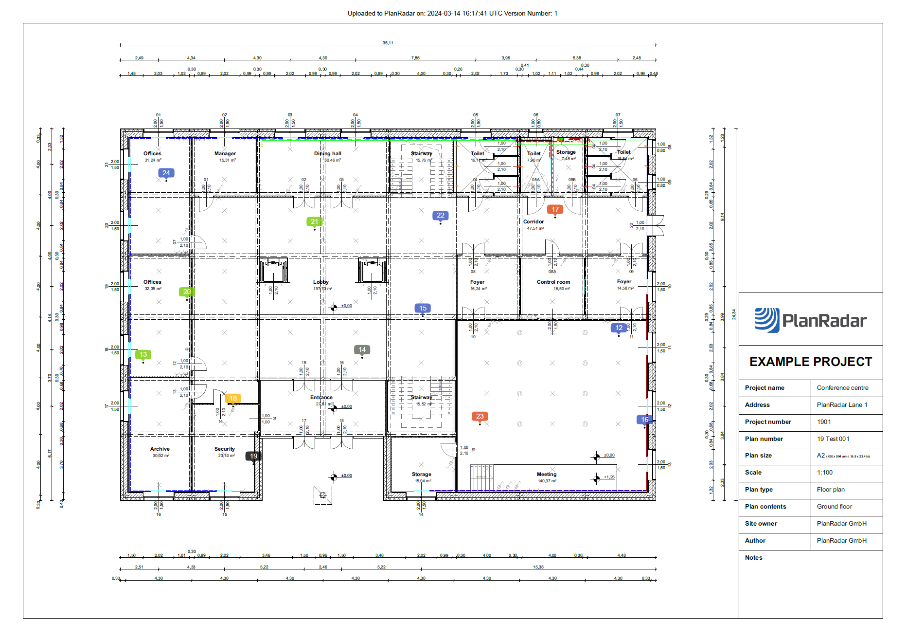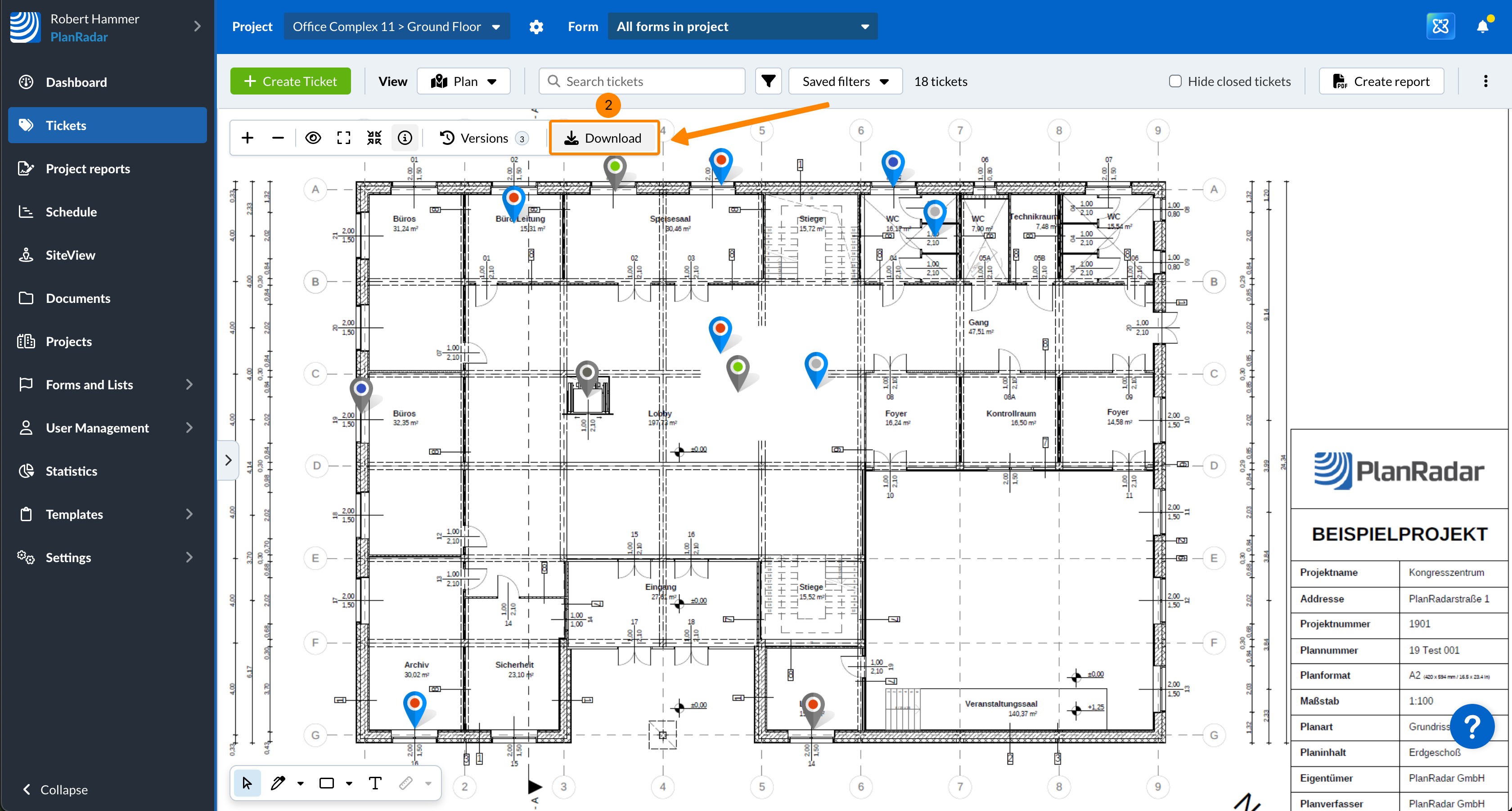 Baixe qualquer plano como PDF para armazená-lo em seu dispositivo ou compartilhá-lo fora do PlanRadar. Opcionalmente, o senhor pode incluir pinos de tíquetes e definir o tamanho e a legenda (ID ou título do tíquete), bem como os metadados do plano (versão do plano e quando ele foi carregado).