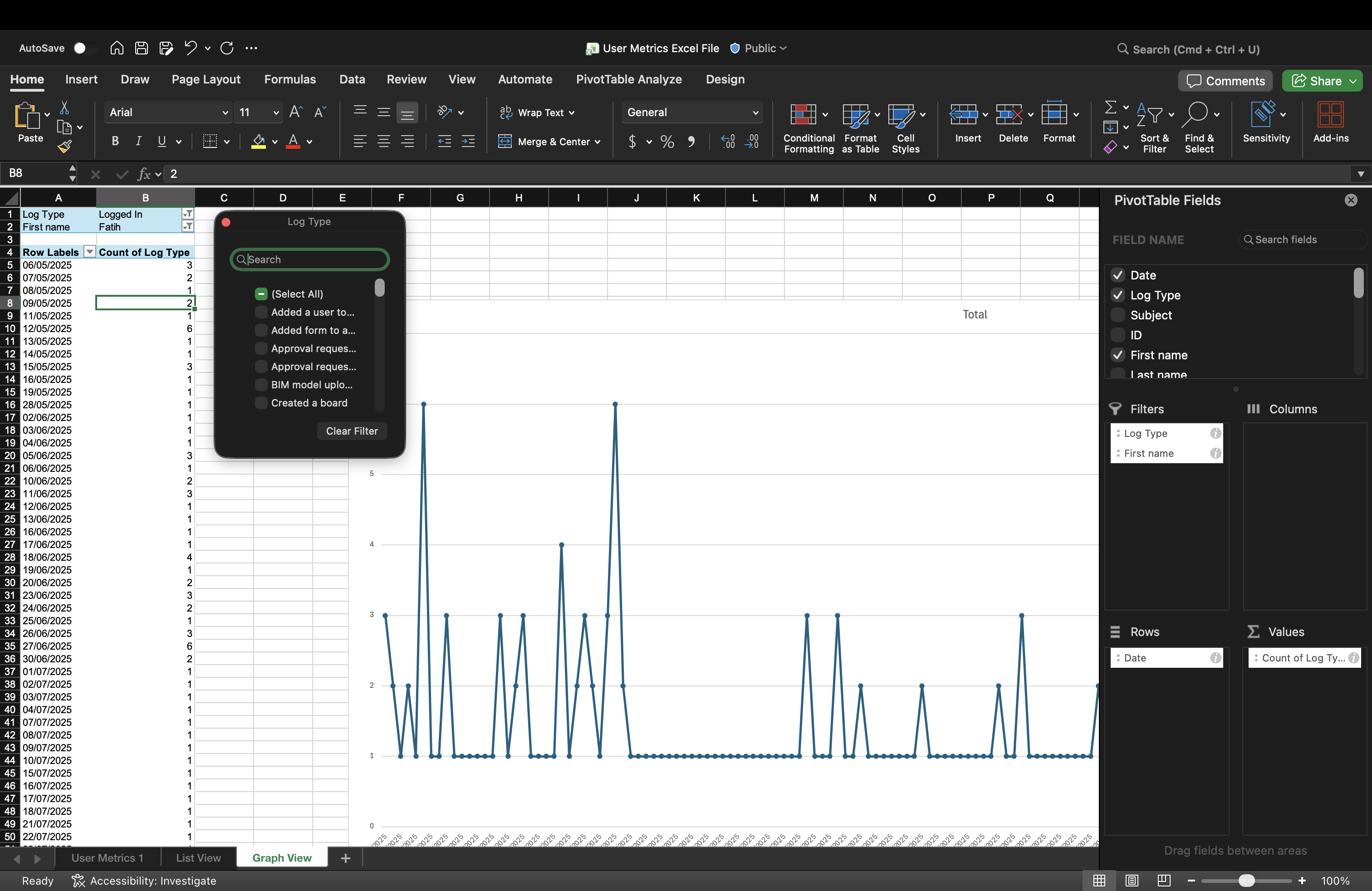 - Aplique filtros para visualizar intervalos de datas ou usuários específicos