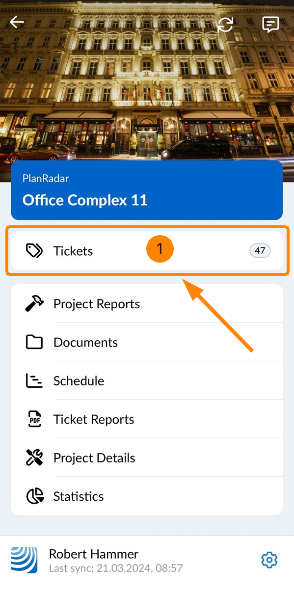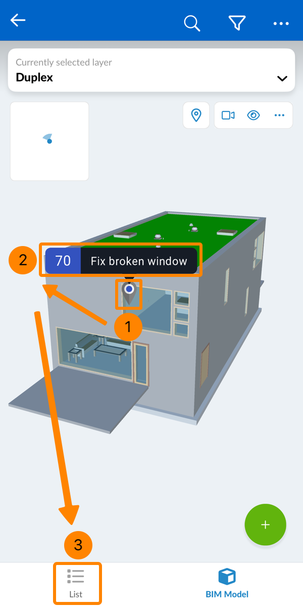 - Clique em um tíquete na lista de tíquetes para ampliar o pino no modelo BIM e abrir a visualização do tíquete