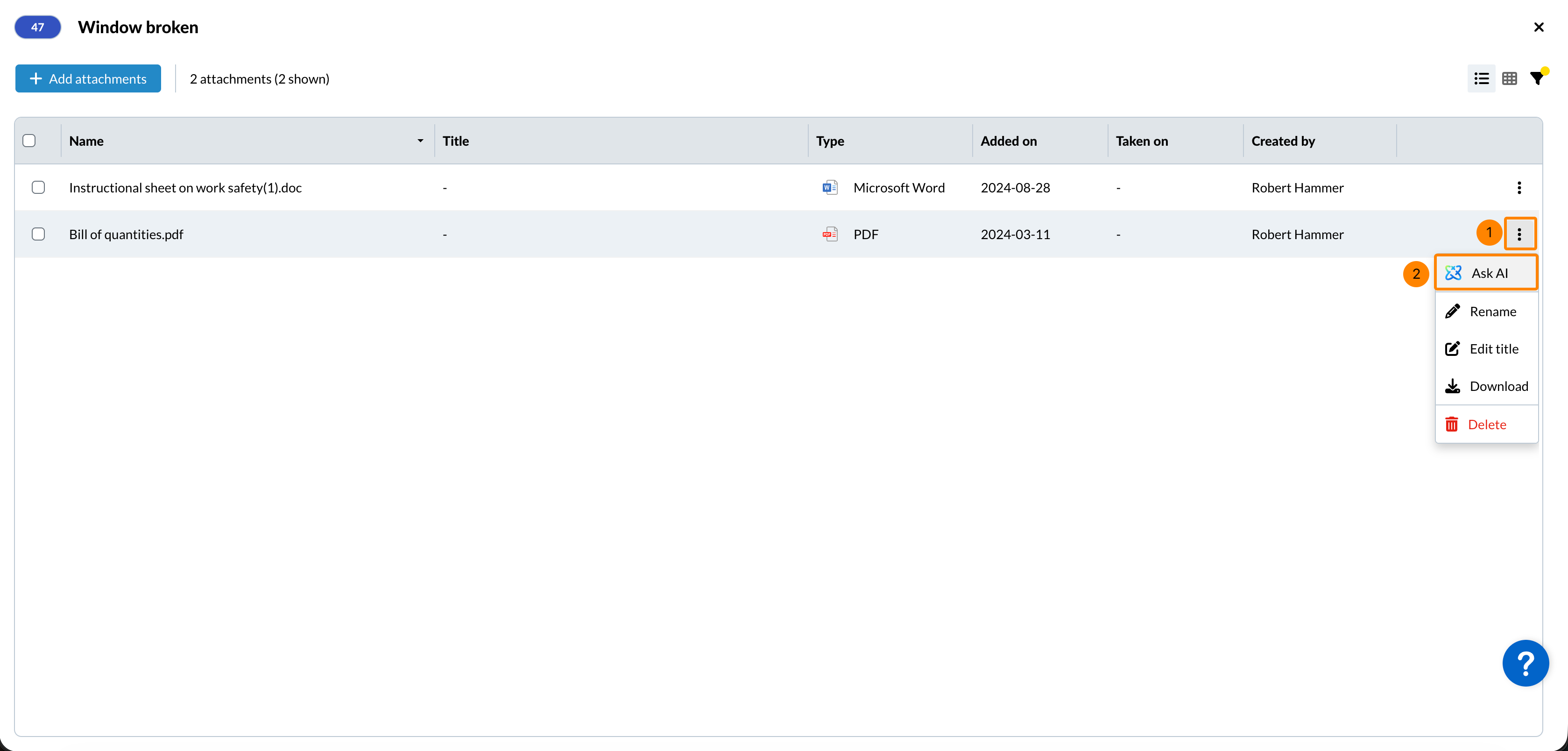 Quando estiver em All files ou Tickets attachments, o senhor poderá acessar a opção Ask AI de várias maneiras: