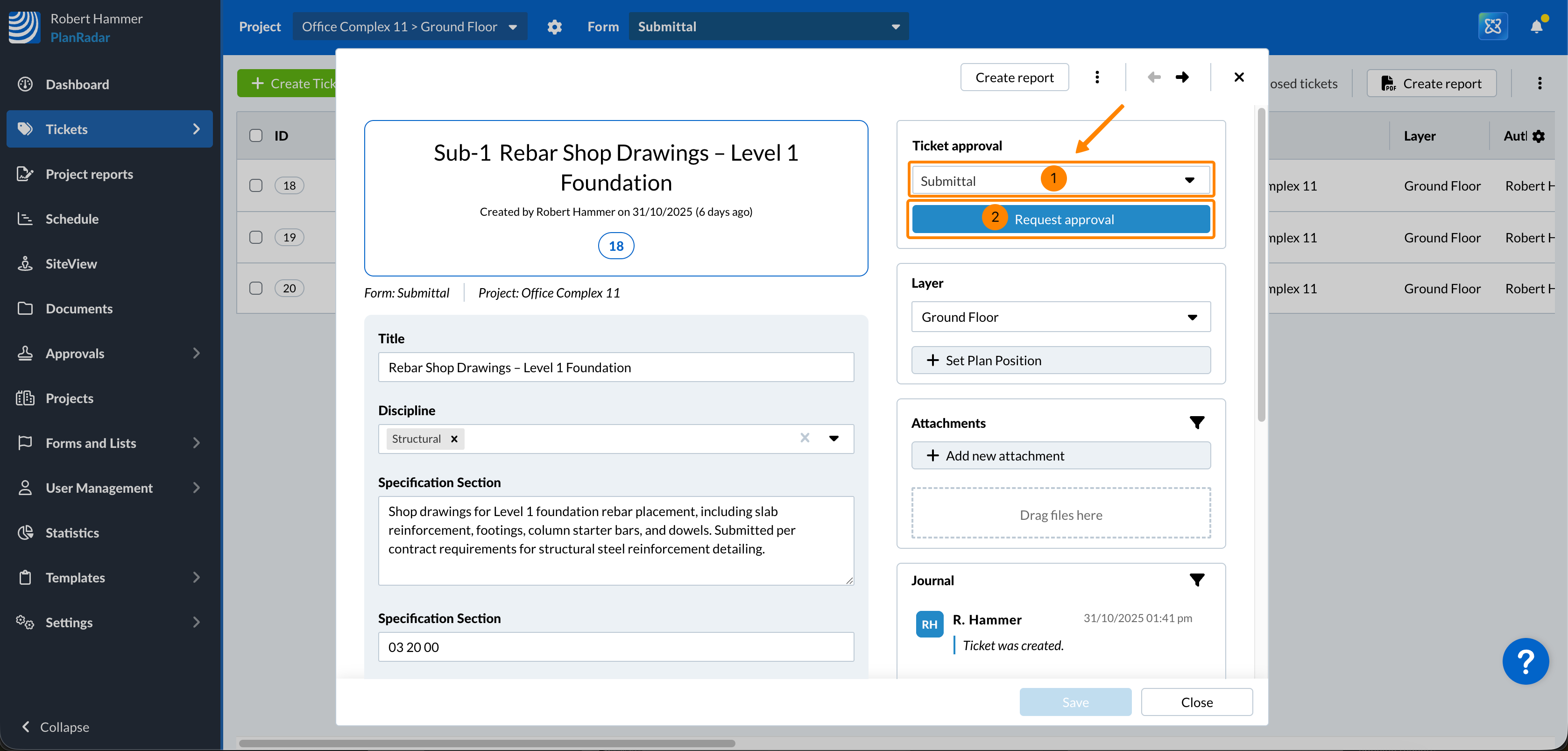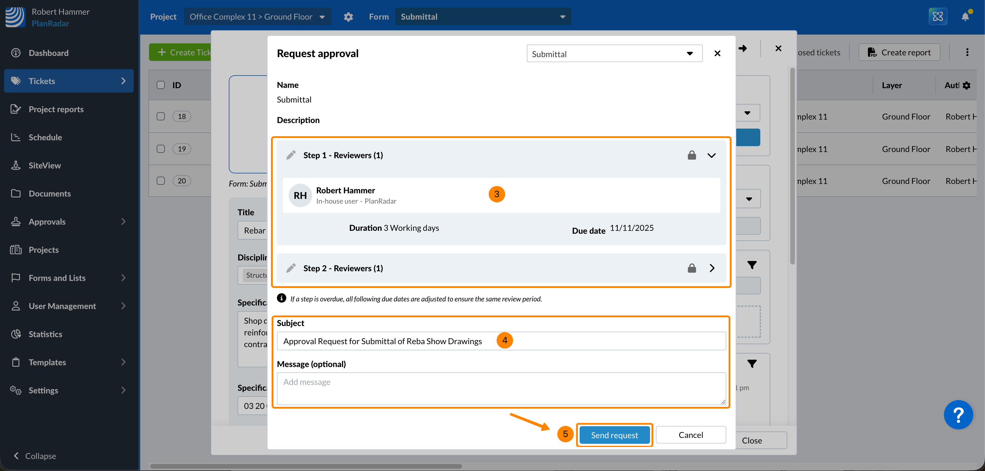 O envio da solicitação bloqueia o site Tickets e os revisores da primeira etapa de aprovação são notificados automaticamente. Leia mais em Review & Approve Tickets.