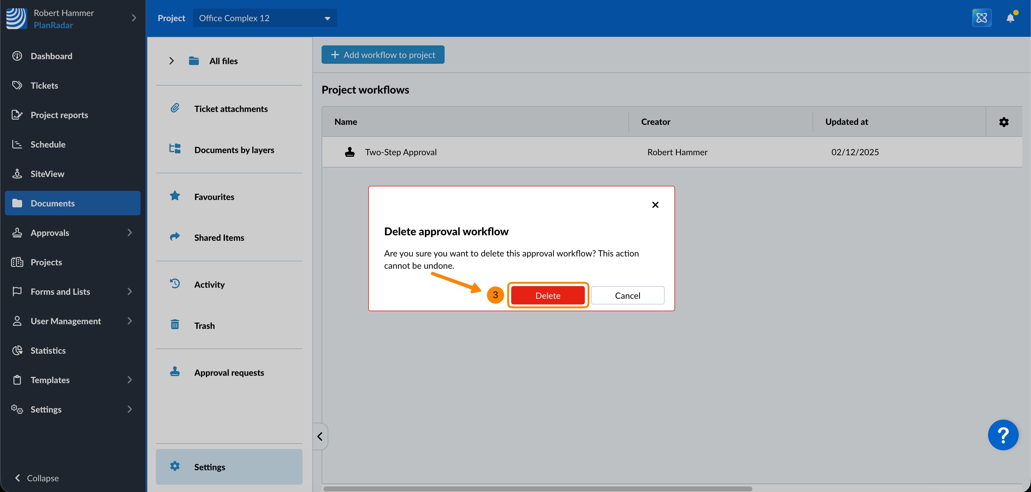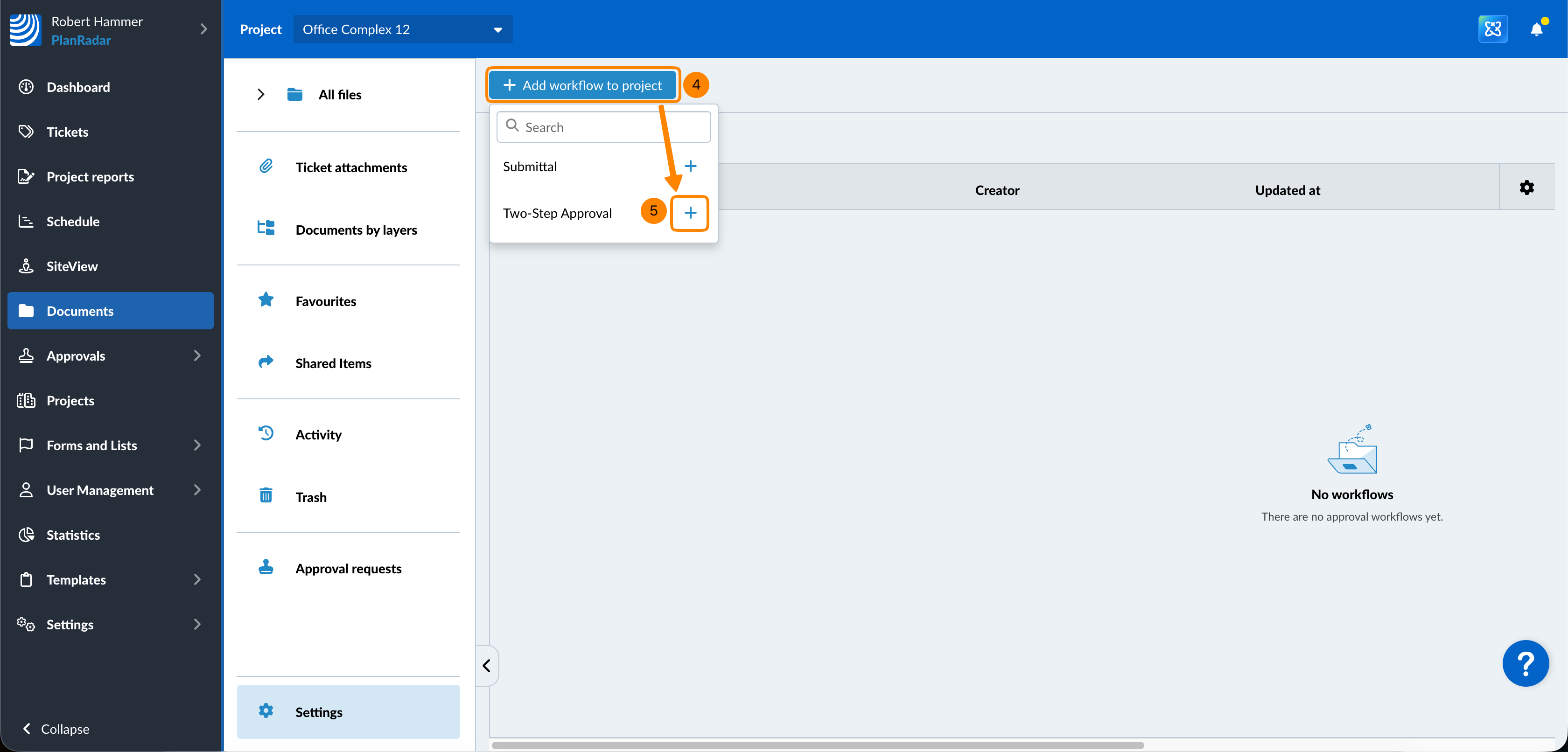 Adicione fluxos de trabalho à seção Documento dos projetos para torná-los disponíveis ao solicitar a aprovação de documentos ou planos. Para isso:
