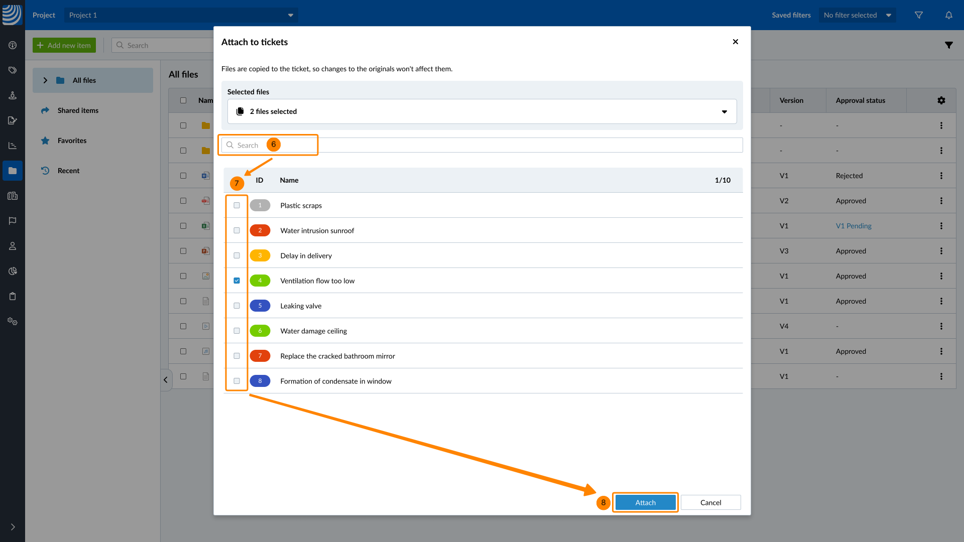 O senhor pode anexar arquivos armazenados na seção Documents a um ou vários tickets no Webapp.