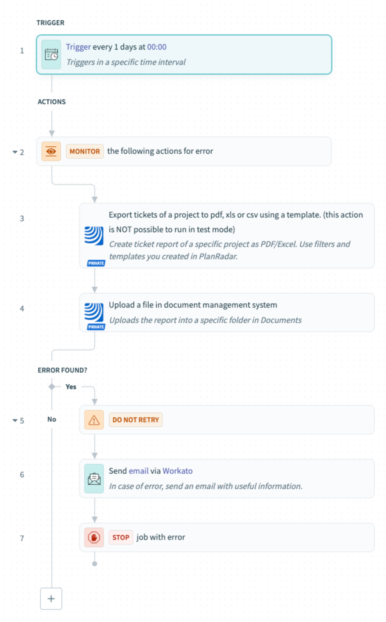 A receita é acionada com base em um intervalo programado (por exemplo, todos os dias). Em seguida, ela gera o relatório e o carrega na pasta PlanRadar Documents especificada.
