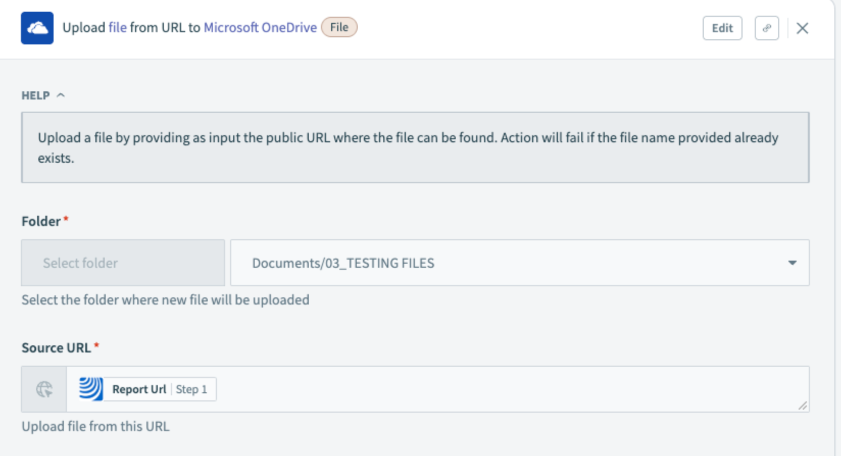 Em Upload file from URL to Microsoft OneDrive, mapeie o arquivo de relatório e o caminho da pasta