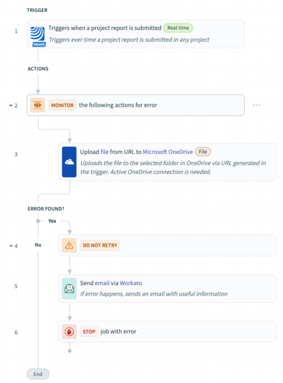 Sempre que um relatório de projeto é enviado em PlanRadar, a receita faz o upload para o OneDrive.