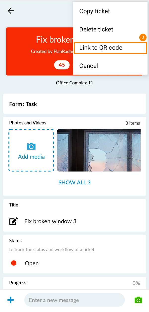 Vincule os tickets do PlanRadar com códigos QR para economizar tempo e encontrar o ticket correto ao trabalhar no local. Digitalize o código QR com sua câmera ou com o aplicativo móvel PlanRadar e o ticket vinculado será aberto.