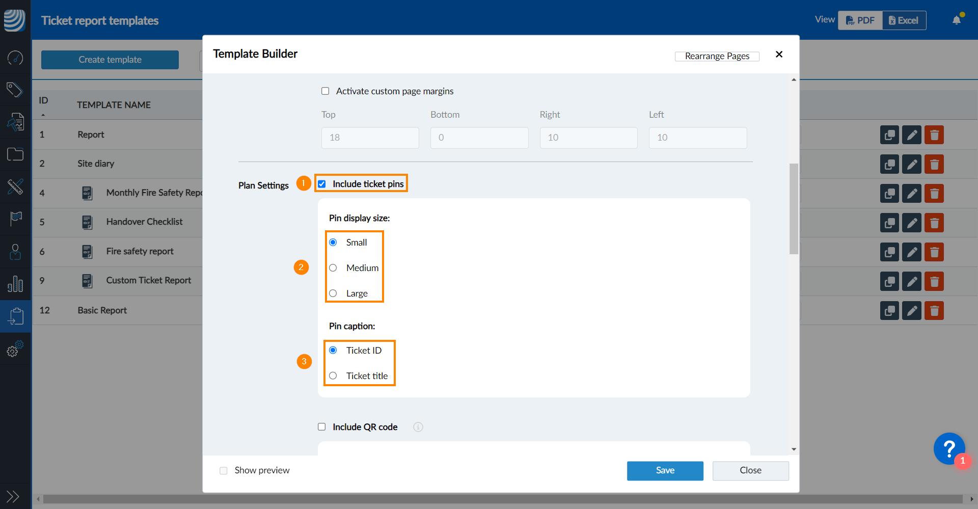 Вы можете включить булавки билетов в планы, определить размер булавки и показать ID или название билета. Планы появляются на последней странице отчета в виде общей сводки булавок.